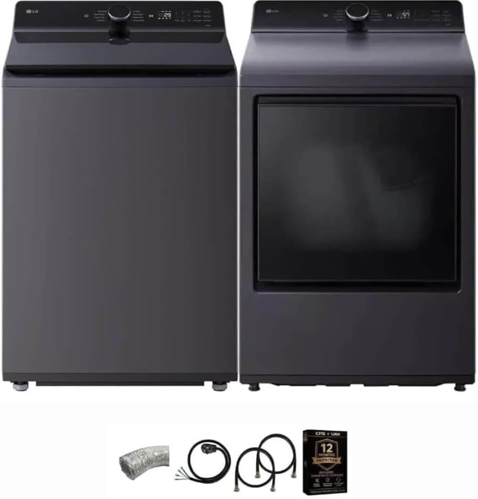 LG Matte Black Mega Capacity Top Load Washer and Dryer Pair with TurboWash Technology SmartThinQ WiFi Connectivity Steam Dry Sensor Dry Dryer Vent Power Cable and 12 Month CPS Protection Plan (Black)