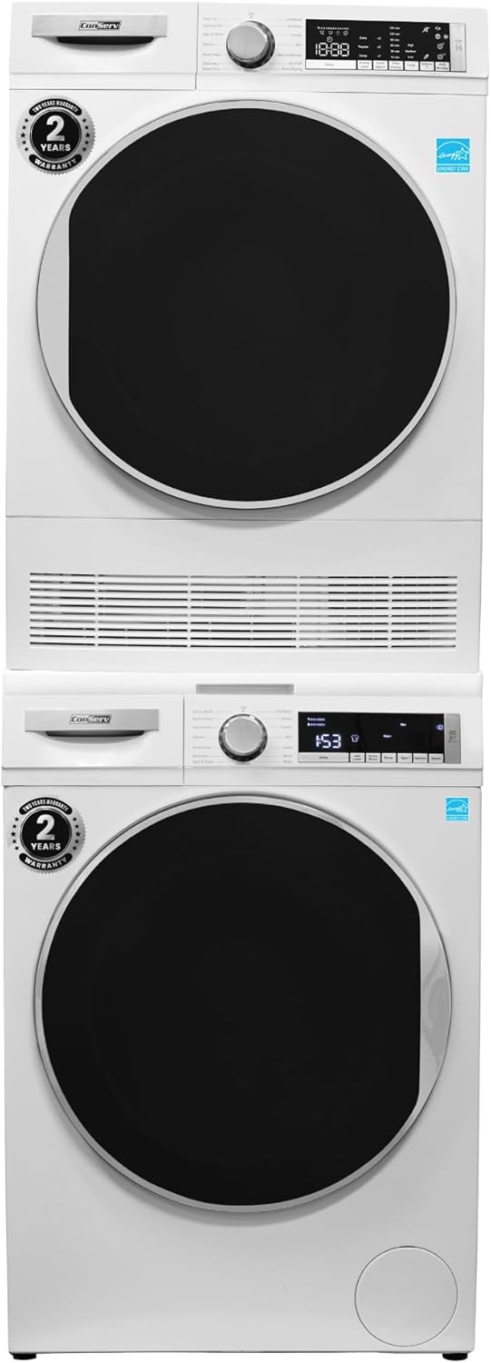 Conserv Front Load Washer & Condensing Dryer, 2.2 cu ft Washer (110V) + 4 cu ft Dryer (220/240V), ENERGY STAR, 15 Cycles, Stainless Steel Drum, LED Display, Compact Laundry Pair (White +Stacking Kit)
