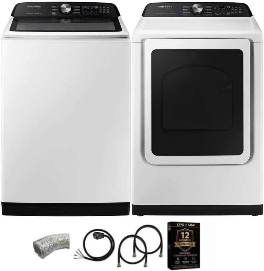 High efficiency 5.2 cu ft top load washer delivers powerful cleaning performance while using less water and energy for everyday laundry needs Large capacity 7.4 cu ft electric dryer easily handles bulky items like comforters towels and large family loads Smart washer functionality allows remote monitoring cycle control and alerts through compatible mobile devices Multiple wash cycles and temperature options provide flexible care for delicates heavy fabrics and everyday clothing Sensor dry technology automatically adjusts drying time to help prevent overdrying and reduce energy usage Durable stainless steel washer tub resists chips and odors for long lasting performance and easy maintenance Clean white finish offers a classic look that blends seamlessly into any laundry room or utility space Includes washer fill hoses dryer vent and power cord for a more complete installation setup Designed for reliable everyday use with simple controls and efficient operation Bundle includes a 12 month CPS Protection Plan for added peace of mind beyond the manufacturer warranty